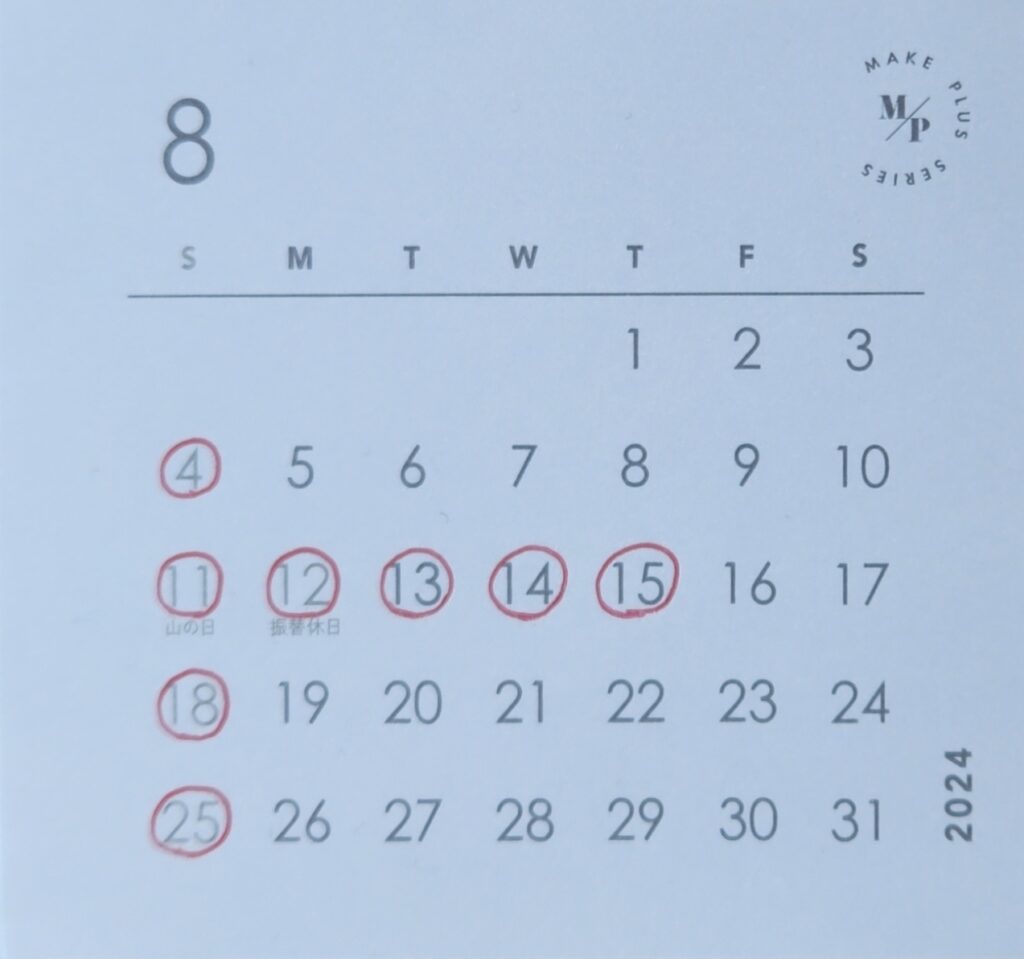 8月営業日のお知らせ