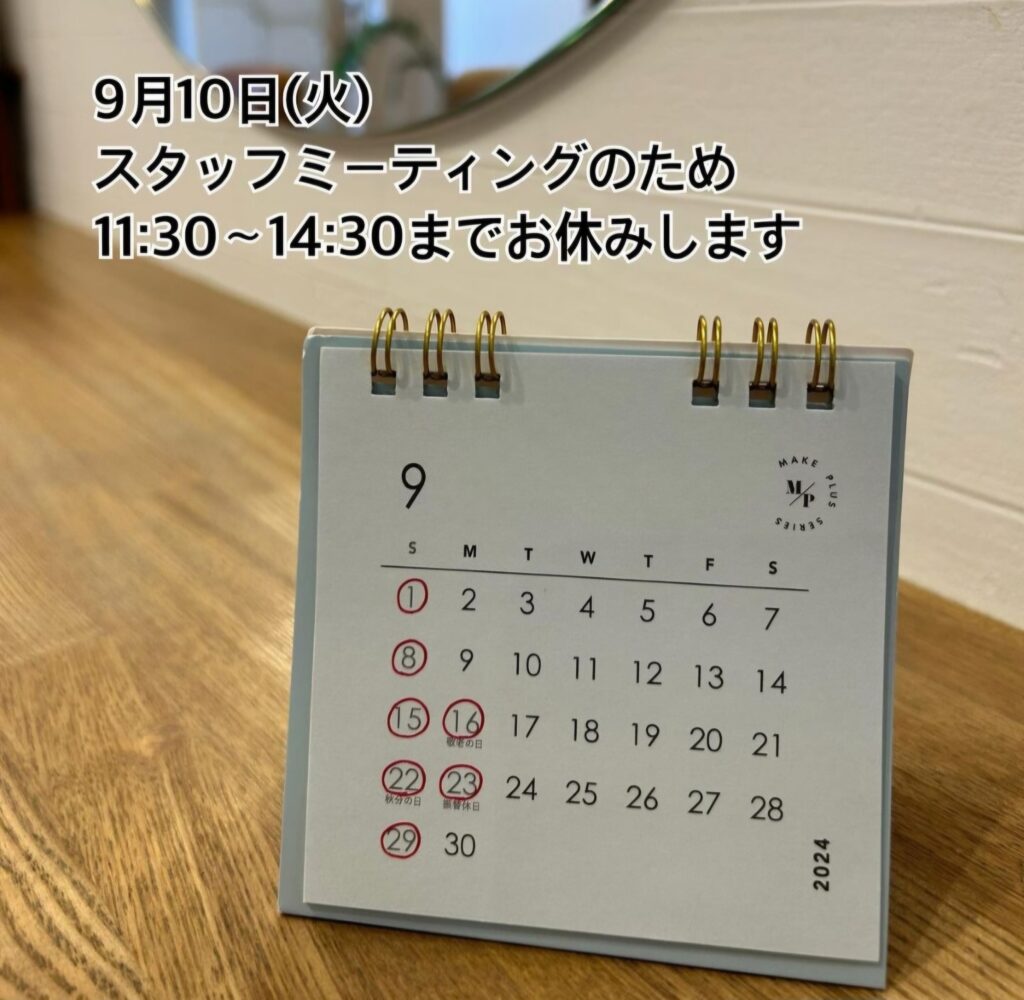 赤丸が定休日となります🙇♂️ 10日はミーティングのため11時半から14時半までお休み頂きます。 お電話も繋がりませんのでご了承ください📞 9月10月11月の土曜日は、スタッフの子供も学校行事が多く、出勤人数が限られて […]